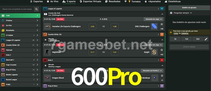 A aposta 600Pro oferece aos jogadores a experiência mais conveniente de apostas em eSports!